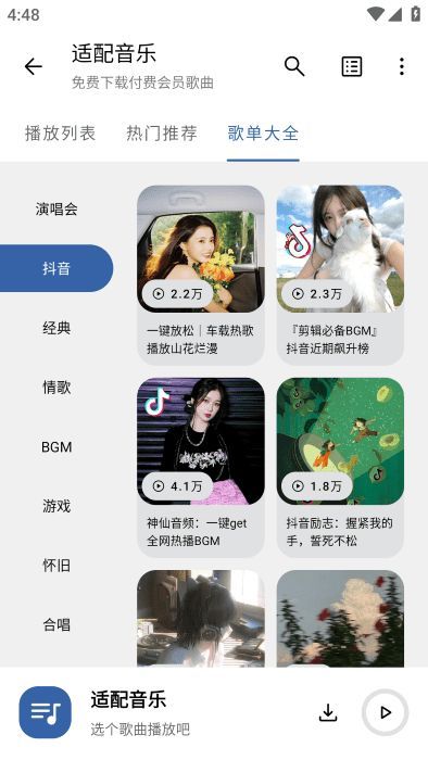 配适音乐是一款功能强大的音乐软件,它拥有庞大的音乐版权库,涵盖各类音乐和热门歌手作品,像网易云音乐的一些独立音乐人作品也有独家版权,能满足用户多样听歌需求。软件会依据用户听歌历史、收藏和搜索记录,精准推荐符合口味的歌曲。