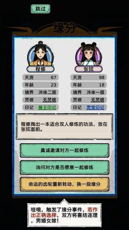 开局可查看基础信息,若不满意可点击左下角重新随机。能自行设置家族字辈,每一代都可灵活设置或不设。不同的家族图腾对应不同功法,神柳图腾伴随升级总计解锁24种功法,侧重提升族人修为增加速度;玄鉴图腾解锁的24种功法,侧重于提升族人攻击;棺材板图腾解锁的24种功法,稍侧重于提升族人生命。家族图腾初始解锁的功法是元类[镜元诀],安排家族成员修炼可每月自动增加修为。点击下方+号能选择人物修炼功法。不同的仙峰会有不同效果,开局选的寒月峰灵气稀薄,但也能大幅提升家族成员修炼效率,同样点击下方+号可安排人物前往修炼。点击右下角开启时间,人物即可开始修炼,修炼途中会遭遇随机事件。若遇到缘分事件,邀请对方一起修炼,选对选项还能结婚。每月自动增加修为需消耗灵石,灵石不足会暂停修为,玩家要合理使用。