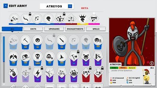 多种火柴人战士供选,各有独特技能特点。玩家可升级增强战士战斗能力,赢取最终胜利。游戏设有平原、山脉、森林等战斗场景,各有战略价值。