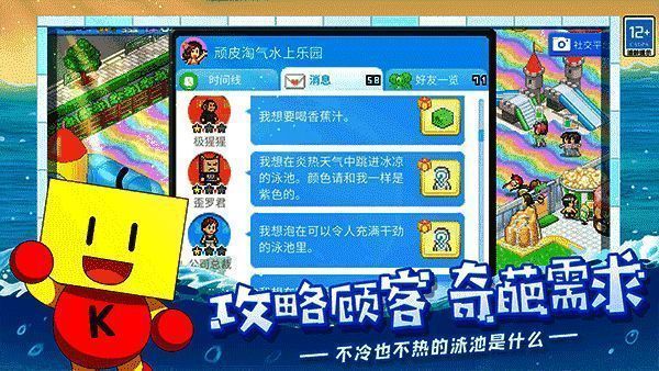 该游戏延续了开罗游戏的一贯风格,玩法与其他系列相似。玩家需逐步建设水上公园,可进行扩建泳池、建造厕所和滑梯等操作,还能种植绿植增添活力。此外,玩家能通过社交平台与客人交友,根据其意愿建造餐厅、调配池水,让客人满意。感兴趣的朋友可下载最新版本游戏体验。