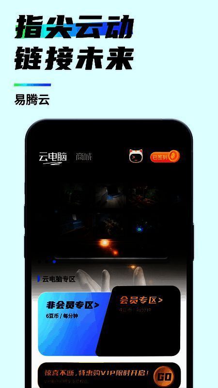 易腾云官方正版,作为极具创新性的云游戏平台,以其顶尖的技术和丰富多元的游戏库,在行业中独占鳌头。玩家无需配置高性能硬件,就能即刻畅享各类主流手游与PC游戏,收获高清且流畅的游戏体验。平台具备强大的云计算能力与智能网络优化技术,全力保障玩家始终拥有顶级游戏质量。