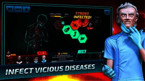 游戏拥有八大系统(如同人体系统):循环、呼吸、神经、肌肉、肾脏、骨骼、消化、免疫系统。玩家借助这八个系统操纵致命疾病攻击人体器官和系统功能,制造细菌和病毒,使患者全身器官衰竭。玩家可用收集的病毒点数解锁症状或引发并发症加速病情,还能为患者增添不良生活习惯,影响医护群体救护水平。建议先让患者养成坏习惯,搞垮免疫力,攒够病原体再一举击败。