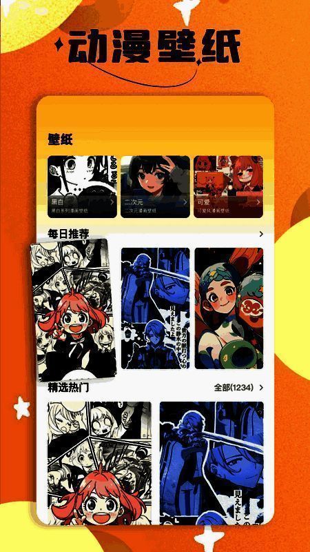 4、精美壁纸专区:“漫画壁纸”专区有大量精美壁纸资源,可按类别准确推送,用户一键下载,为手机桌面增添二次元氛围。