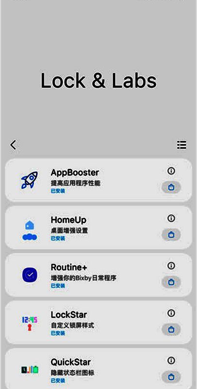 4、Lock & Labs整合Good Lock和Galaxy Labs功能,可排序,已安装的靠前排列,还能安装、卸载、长按添加快捷方式到桌面。