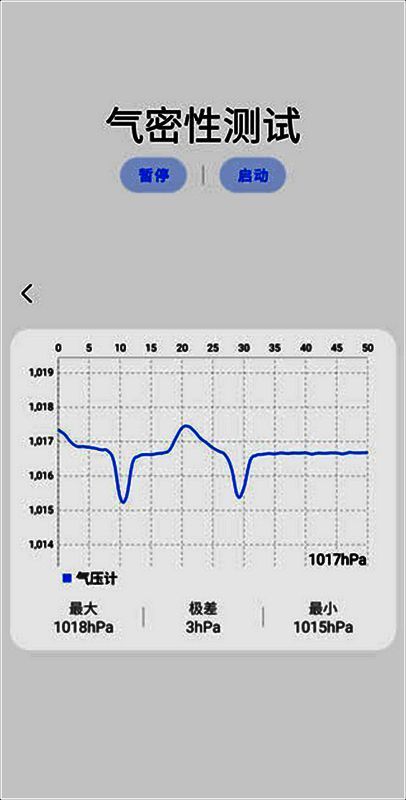 1、气密性测试:能暂停/启动(便于截图)、自动计算极差、显示最大/最小压力,可从主页上方图标或关于手机界面右上角进入。