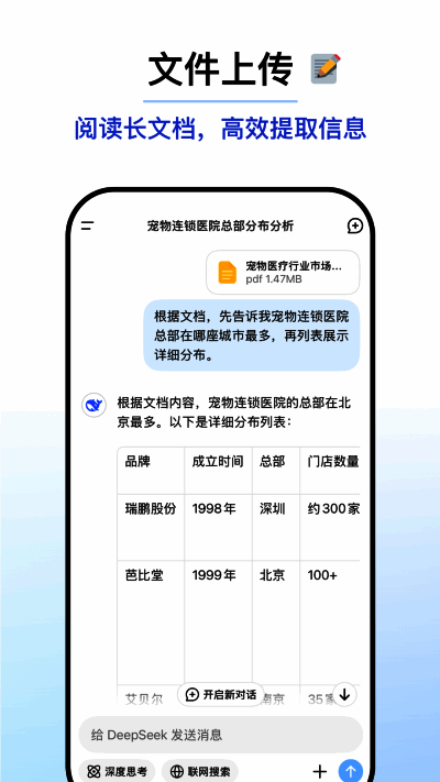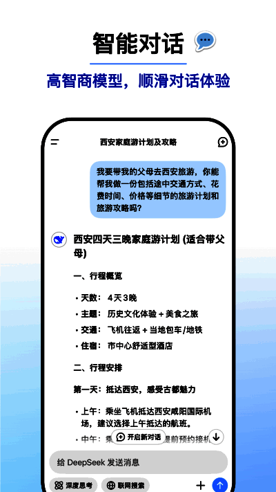 DeepSeek是一款基于先进自然语言处理(NLP)技术的人工智能工具,具备理解、分析和生成高质量文本内容的能力,适用于多种场景。该软件提供精准的问答服务,支持上传多种格式文件,并从中提取文字信息,还能对文件内容进行总结、分析或生成报告。其强大的数据分析功能可助力用户从海量文本数据中提取关键信息,生成可视化报告。大家若感兴趣,可下载DeepSeek App体验一番!