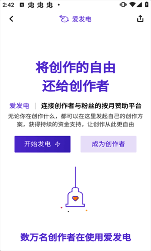 (1)爱发电是连接创作者与粉丝的会员制平台,支持各类创作者建专属社区,获资金支持,实现创作自由。