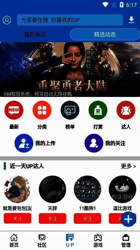 1、打开app,进入主页面选择“up”功能按钮,点击进入找到达人排行,选择指定达人。