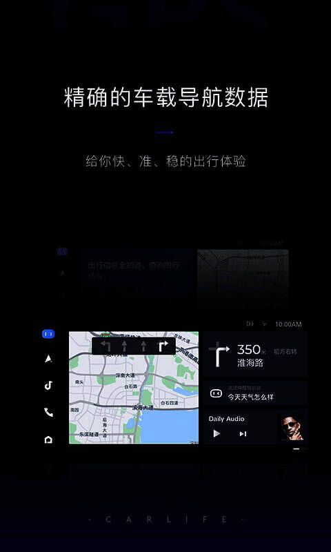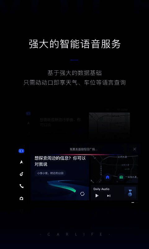 1. 地图导航:连接汽车数据,实现更精准的导航。CarLife 完美整合百度地图,提供全面、准确的海量位置信息;实时智能交通更新,让您告别拥堵和罚款。