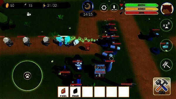 3、昼夜生存机制:白天探索资源、建立基地,晚上对抗怪物,合理配置资源升级科技,带来“生存 + 塔防”双重战略考验。