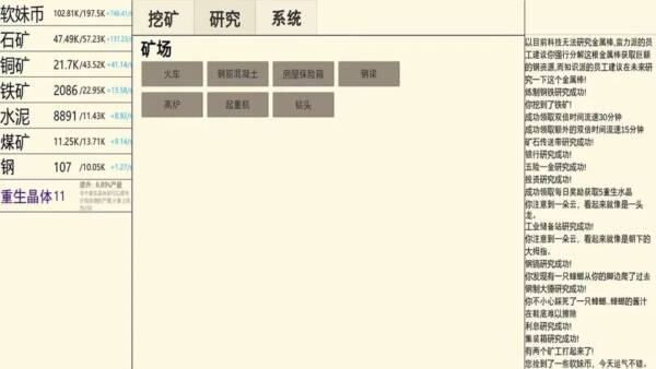 1、《重生挖矿》的核心玩法围绕资源获取与管理。玩家点击屏幕上的“挖矿”按钮模拟开采,获取基础矿石资源,这是游戏发展的起点,为后续科技研发和设施建造提供材料。