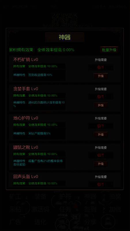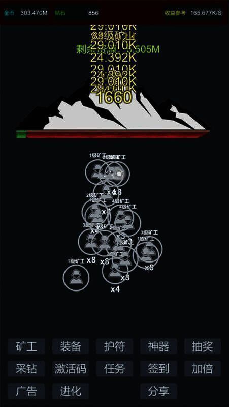 1、玩法围绕多线养成系统展开,包含矿工、装备、护符与神器的全方位提升。