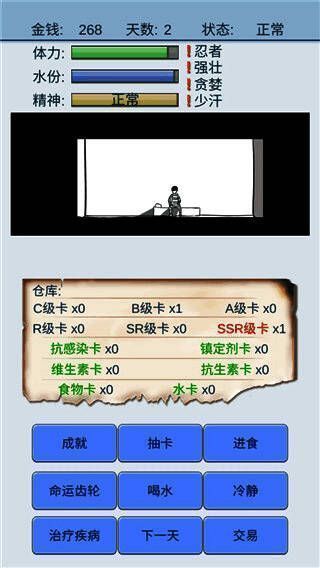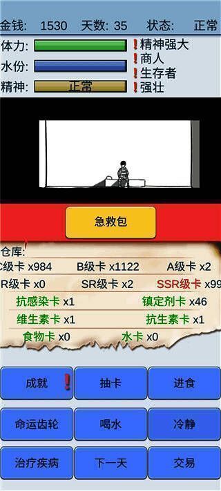 例如,“大海的诞生”天赋会让抽到水牌的概率提高,“幸存者”天赋能增加抽到生存牌的概率,“商家”天赋可查看第二天的交易价格。游戏主角有体力、水、精神三种属性,体力或水属性耗尽主角就会死亡,精神状态分为正常、抑郁、疯狂三种,精神疯狂时主角可能在睡觉或抽SSR卡时死亡。在最新版本中,玩家每天会收到随机金额用于抽卡,运气好能获得足够食物和水卡维持健康,若抽不出高级卡则可能陷入疯狂。此游戏趣味十足,感兴趣的玩家不妨下载一试!