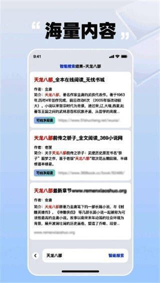 各种类型小说云集,告别书荒。可通过搜索查找心仪小说,发现更多佳作。支持自由切换背景主题,随意调整字体和大小,定制专属阅读需求。全网搜索内容,让你想看的都能在这里找到。