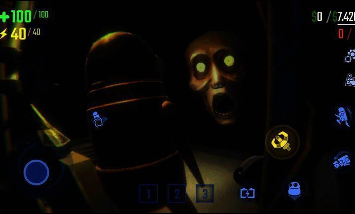 4、点击新游戏进入地图,正式开始后,左边控制移动,右边是跳跃、蹲下、翻滚按钮,中间下方的123是口袋,可放入拿到的物品。