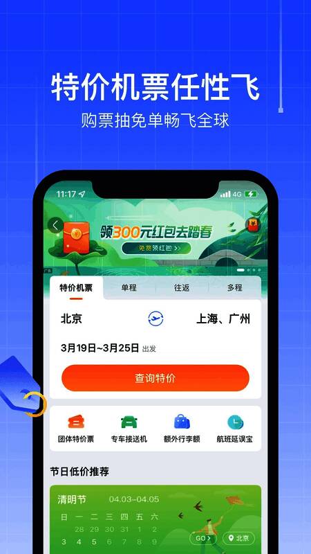 1. 用户输入出发地和目的地,点击“搜索折扣机票”,就能快速找到优惠航班。