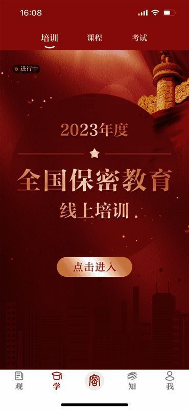 打开保密观app后,点击右下角“我”,或者底部的“学 - 培训”即可登录,如图所示。
