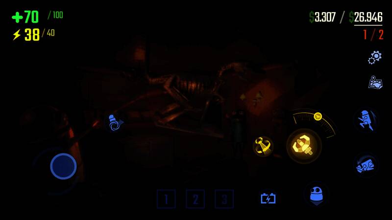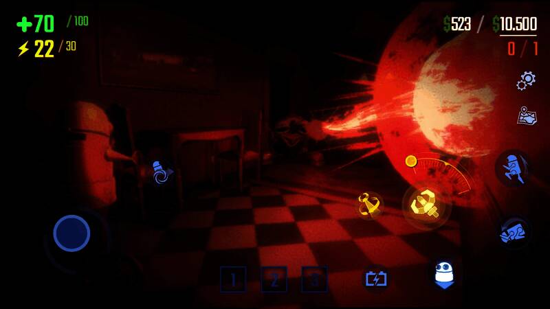 4、点击新游戏进入地图,正式开始后左边控制移动,右边是跳跃、蹲下、翻滚按钮,中间下方123是口袋,可放入拿到的物品。