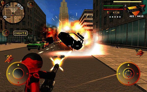 1、基础操作:左侧控制移动、加速,右侧控制绳索、攻击(跳跃)、跳跃,右上侧实时显示武器更换、血量和经验。玩家可自由玩法,与其他帮派人物交火,杀敌获经验,杀多产生星级后会引来巡警等角色进攻,需思考如何存活和击杀敌人。