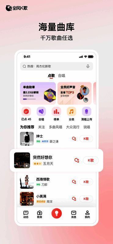 全民K歌为用户提供了极为丰富的曲库和伴奏资源。各种热门歌曲、经典老歌、小众佳作都能找到,无论你喜爱流行音乐的动感节奏,还是钟情民谣的悠扬旋律,亦或是热爱摇滚的激情澎湃,都能在此找到心仪伴奏,尽情放声歌唱,无需担忧找不到合适曲目。
