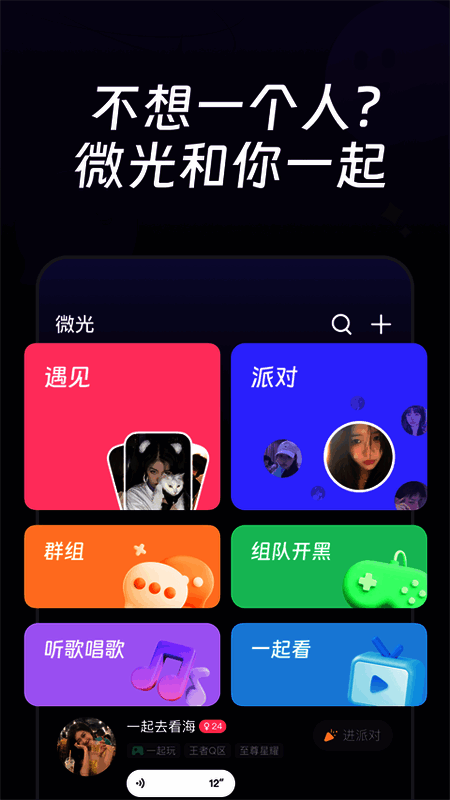 微光官方版app能开房观影,有聊天窗口互动。支持多种注册登录方式。首页清晰展示看视频、交友、听歌、玩游戏等功能,可与异地好友共赏影片、交流话题,值得一试。