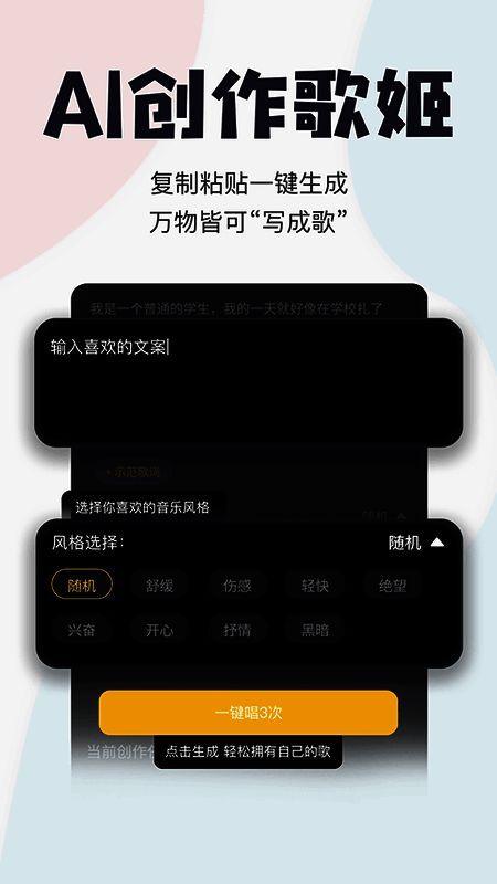 2. 强大的创作功能,输入歌词、选择风格,唱鸭AI就能帮你创作并演唱优美音乐。