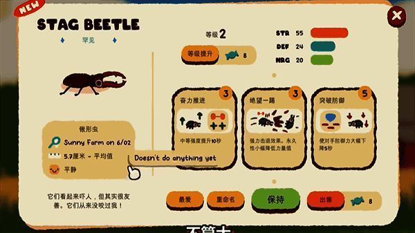 3、每只昆虫都有独特技能和属性,合适的培养方式能让它们在战斗中实力更强。