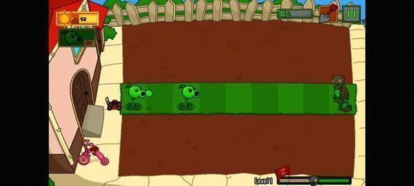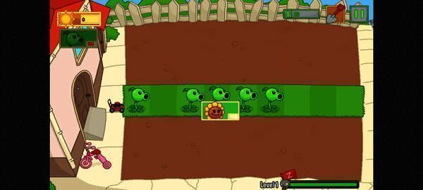以第一关为例,玩家需要收集阳光种植植物,合理搭配种类来阻挡僵尸进攻。