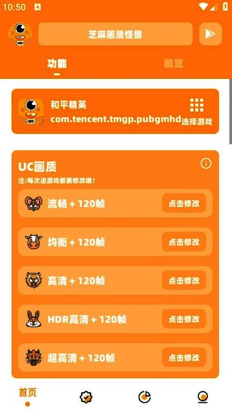 1、打开软件后,用户按需选【点击修改】选项。2、进入概览页面依设备性能选合适画质。3、工具页面有超广角、参数模拟器、准星助手等工具。4、功能页面有重复名生成、翻译大师、起名神器、二维码生成等功能。