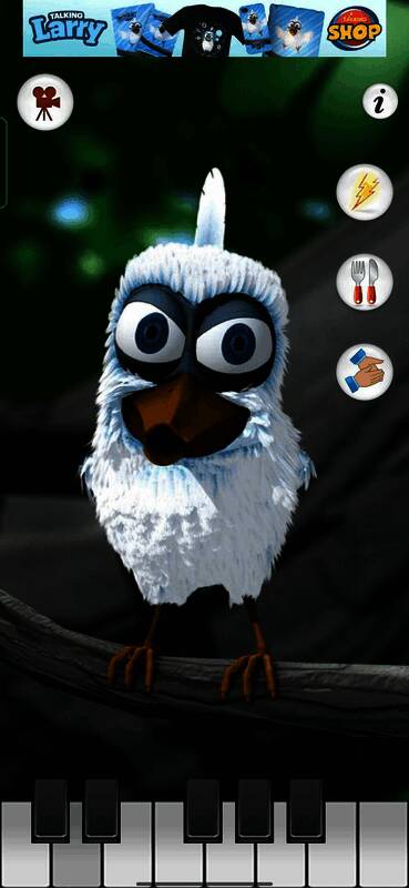 点击闪电图标,闪电会击打拉里鸟;点击刀叉图标,给拉里鸟喂食;点击鼓掌图标,出现掌声,拉里鸟做谢谢动作;点击屏幕下方钢琴按键,拉里鸟发出不同声音。