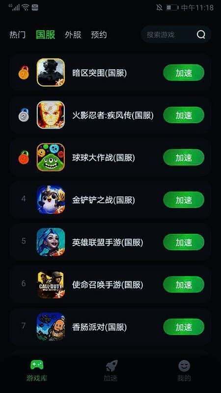 4. 进入【游戏库】界面,有热门、国服、外服和预约等游戏类型,用户可按需选择,也能通过右上角【搜索游戏】查找需加速的游戏。