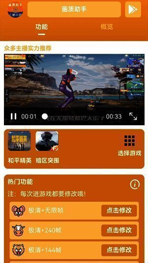 主播同款画质助手和平精英是一款定制化的图像质量修改软件。它功能多样且操作简便,有一键解锁帧限制、启用全画面质量等功能,能让低端手机游戏更流畅,高端手机画面更清晰。