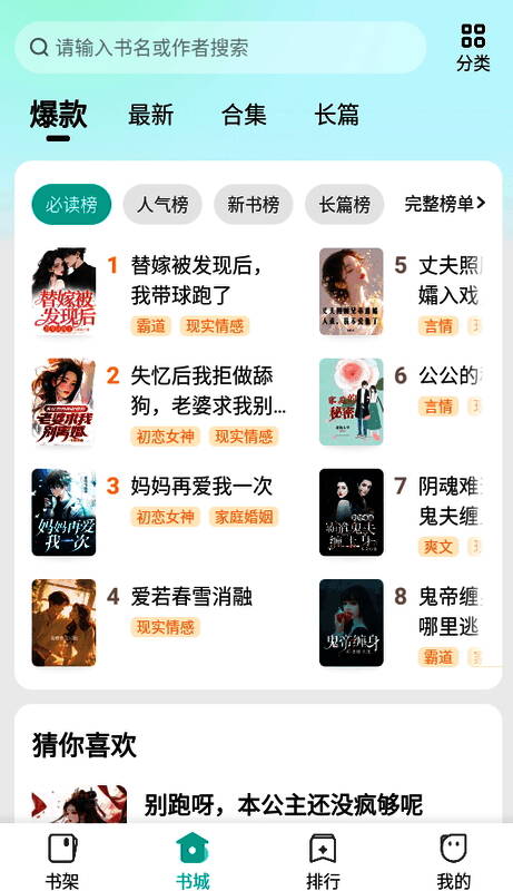 2、进入后点击首页底部的“书城”,再点击右上角的“分类”。