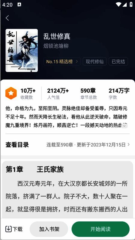 5、直接点开想看的小说进入详情页,点击“开始阅读”。