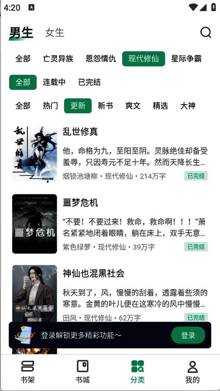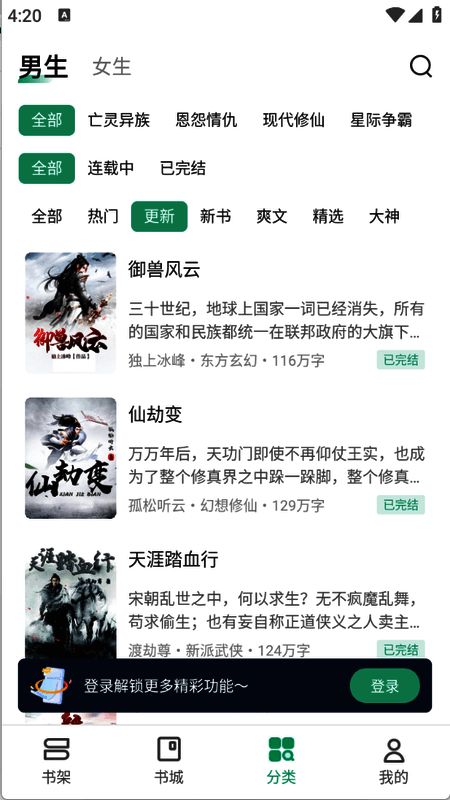 2、进入首页,能看到众多小说资源,还有丰富的分类,男女皆有。