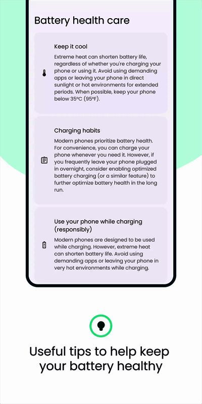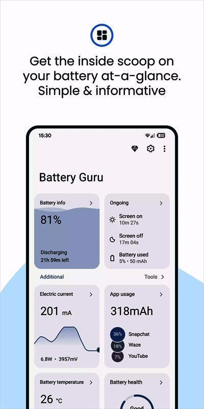 该软件能显示电池使用情况信息,测量电池容量 mAh 并显示估算值,还提供有用的充电技巧,帮助用户改变充电习惯,减少电池损坏,延长电池寿命达 200%。用户使用 Batteryguru 可轻松管理电量、检测电池、查看电量损耗,体验多种充电模式,让手机电池更耐用。