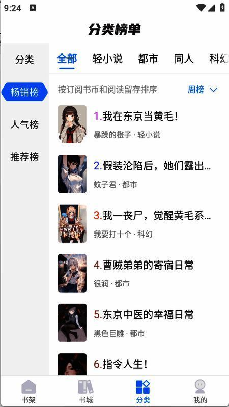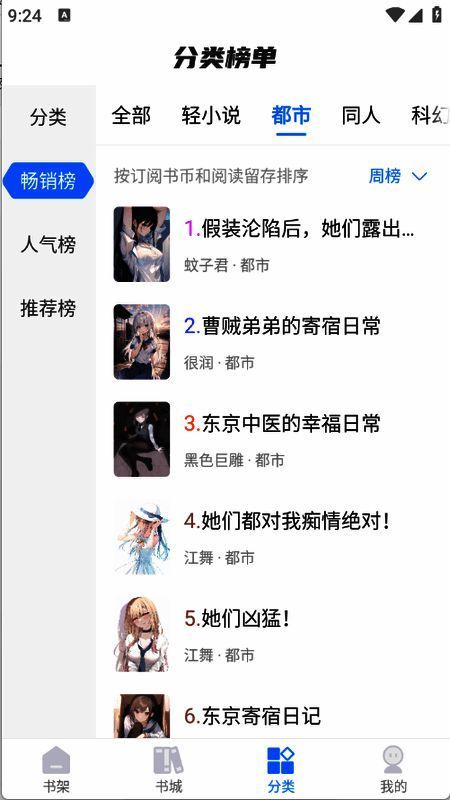 4、分类板块将小说进行了细致的划分,都市、言情以及科幻等类型都有。