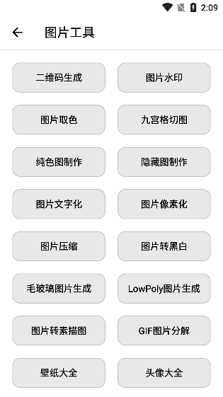 4. 图片工具:二维码生成、图片取色、纯色图制作、图片文字化、图片压缩、毛玻璃图片生成、图片转素描图、壁纸大全、图片水印、九宫格切图、隐藏图制作、图片像素化、图片转黑白、LowPoly 图片生成、GIF 图片分解、头像大全、王者荣耀图集、黑白图上色、头像制作、360 识图、百度识图、搜狗识图、以花识图、次元搜图、以图搜图、图片清晰度提升、视频转 GIF、Ascii2d 识图、AGC 识图、saucenao、Yandex 识图、二次元捏脸、卡通形象生成、搞笑创意图片生成器、转换 JPG、像素肖像生成、纸片人制作、文字生成图片、视频转 GIF②、pdf 转图片、BgRemover、HTML 转图片、压缩图像文件、万物皆可摸、电影字幕生成器、虚拟 ai 生成人脸、AutoDraw、图片无损压缩、油画肖像生成、在线抠图、PornHub 风格图片生成、图片转 ASCIl 字符、图片格式转换、图片 EXIF 信息查看、二维码生成解析、以图搜番、表情包大全 AI 发型设计、三合一收款码、图片拼接、SVG 波浪图生成、图片占位符、图片转 BASE64、在线网页截图、图片加包浆、在线代码截图、ACG 表情包制作、头像加圣诞帽、随机壁纸、抖音风格文字生成、图片提取文字、图片无损放大、微博生成器、人脸相似度对比、圆角图片生成、随机头像、Youtube 风格图片生成、头像加囗罩、短信表情包。