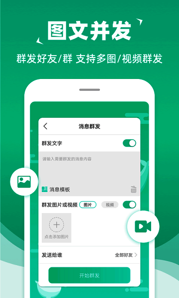 4、多账号切换:拥有多个微信号的用户可快速在不同账号间切换,无需重复登录即可群发消息。