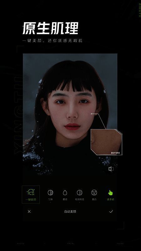 2. 一键操作就能实现高级纹理皮肤效果,自然细腻,无假白现象,轻松打造好肤色。