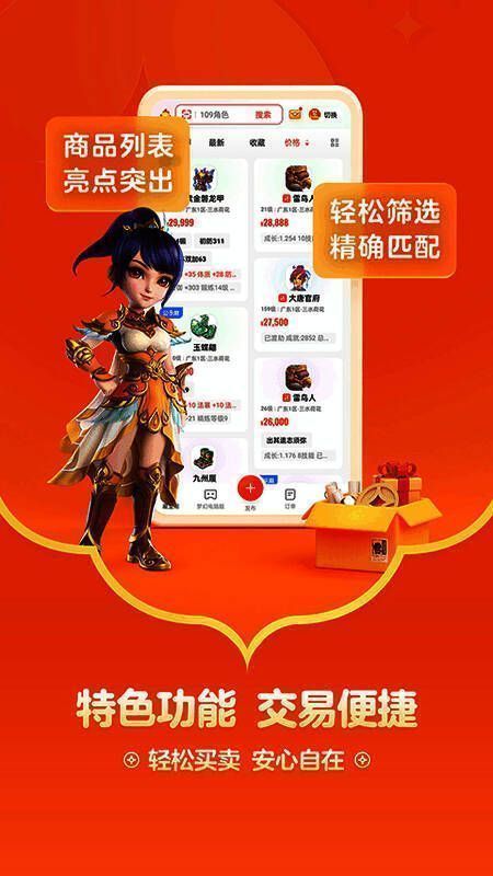 1、【道具】梦幻西游、大话西游、率土之滨、一梦江湖等游戏的装备、道具、外观等,有折扣限时秒杀活动。2、【购买】装备细节清晰,下单即发货,可在游戏内安全取出,防止找回。3、【出售】游戏角色一键上架,快速售卖,保护卖家信息。4、【方便快捷】商品降价、上架、还价等信息实时通知,助你速抢超值好物。
