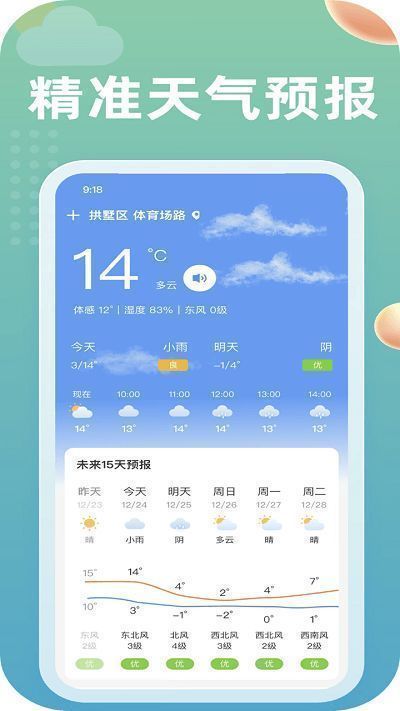 这款软件提供的天气信息十分准确,用户可放心查看第二天及未来15天的天气信息和数据,带来轻松简单的天气查询体验,自由显示最新天气变化。