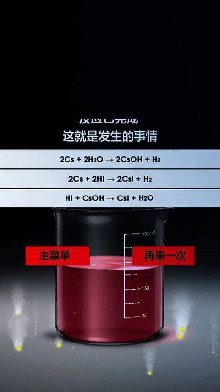 7、反应完成后显示实验生成的化学物,如2Cs + 2H2O = 2CsOH + H2等。