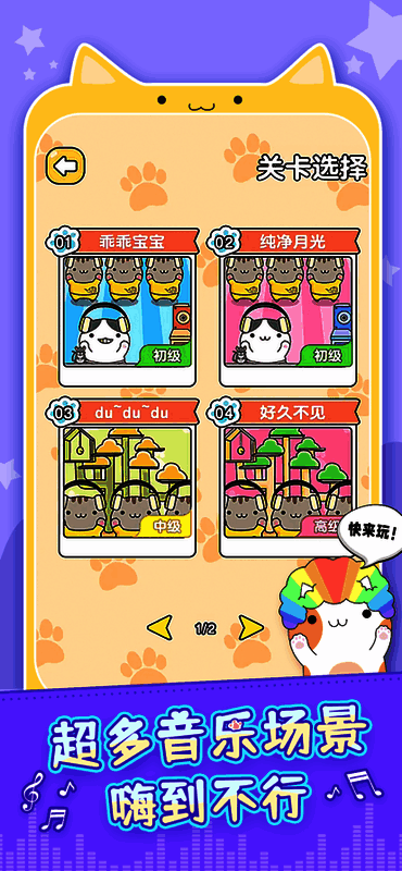节奏猫咪是超有趣的音乐节奏类游戏,玩法受欢迎,操作简单,玩家能依自身能力闯不同关卡,游戏内乐器丰富。