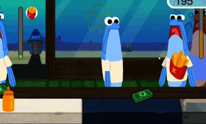 2、派大星,完成订单后不一定付钱,他会随机掏出水母、纽扣、身份证、钻石,纽扣无价值,钻石价值最高,水母不清理会伤害其他顾客,身份证后期有用处。