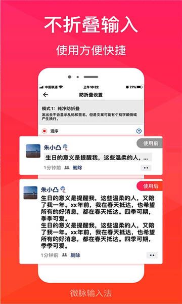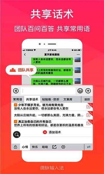 微脉输入法手机版是一款非常实用的输入法软件,深受用户喜爱,还为用户提供超多优质键盘皮肤。喜欢就快来免费下载吧!