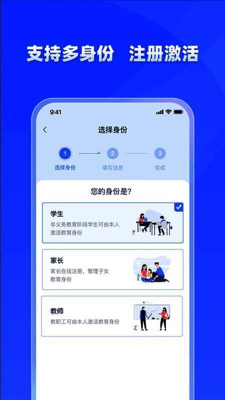 2、选择登录身份,如学生、家长或者教师,点击下一步。