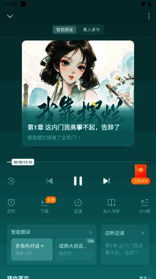 7、还能进行免费听书,有智能朗读和真人讲书两种模式,多种音色可供选择。