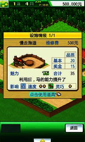建筑方面,训练设施推荐草场(速度+++/爆发+)与沙土场(体力+++/灵巧+)。观光设施该拆则拆,只建品质最佳的,建在门口,四个左右即可。物品按相性添加,能用就用,但不建议购买。等出名马历史馆与场外抽奖处后,将所有物品投入,各建两个在门口,马币与游客评价会大幅提升,收益可观。