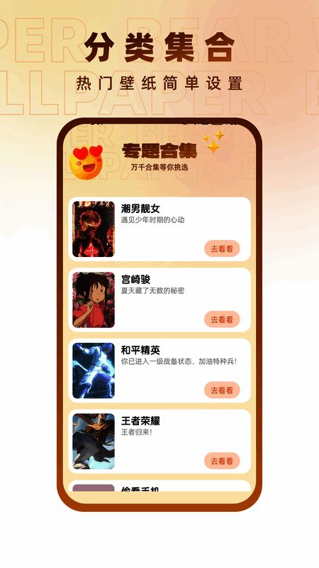 软件内涵盖了各种类型的壁纸资源,从热门主题到独特风格应有尽有。用户可以根据个人喜好自由挑选,无论是清新自然、炫酷科技,还是梦幻动漫,只需轻轻一点即可轻松更换桌面背景,让你的手机界面时刻焕然一新。